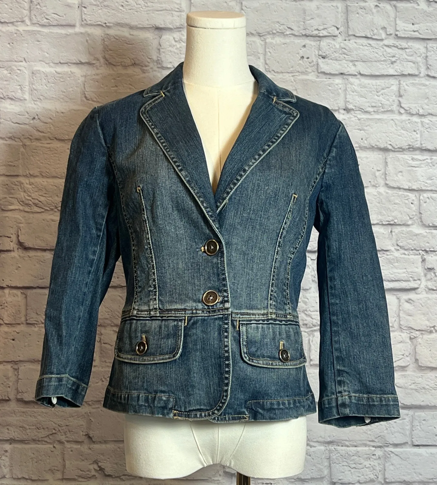 Talbots women's fitted denim blazer in size 6. Designed with a classic notch collar, button front cl... Show more