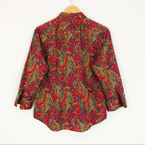 Vintage Ralph Lauren blouse in red with bright paisley motif. Features button-front closure and 3/4 length sleeves with button closure at cuff. Tailored fit, hip length. 100% Cotton Excellent pre-owned vintage condition. No flaws or defects to note. Shoulders: 16” Bust: 21” Waist: 20” Hip: 21” Length: 24” Sleeve Length: 19” Tagged size L/P. Please see approximate measurements to ensure accurate fit. Manufactured by Lauren Ralph Lauren. Circa 1990’s.