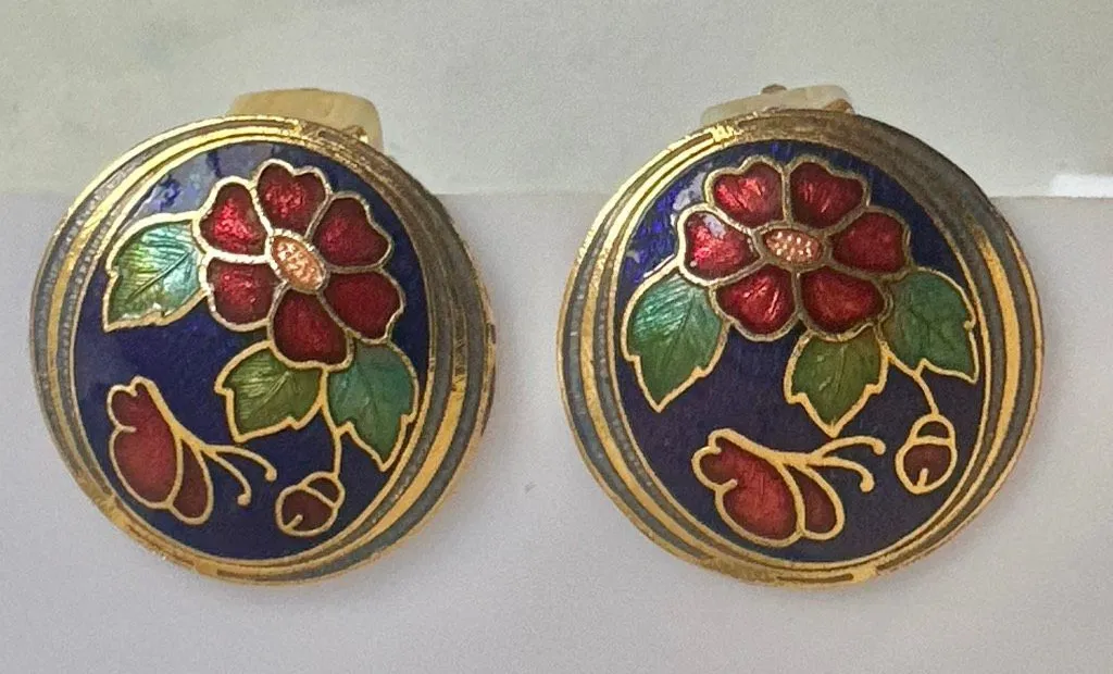 Gorgeous vintage cloisonné earrings featuring a deep cobalt blue enamel background with red and gree... Show more