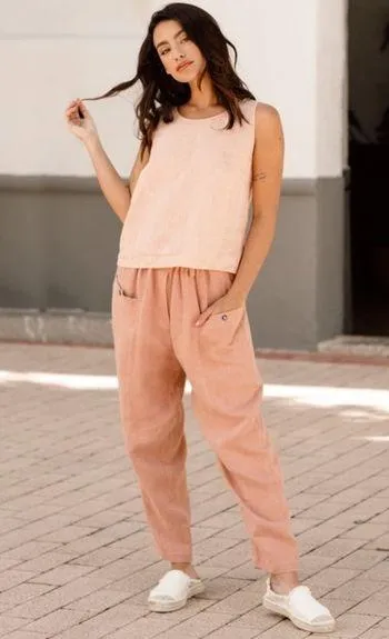 Magic Linen Pants Sz XL Dusty mauve rose blush pink 100% Linen Tapered design Cargo pockets Big snap close pockets Elastic waist Lightweight comfortable Preowned sold as is May be a pull or just the linen texture Shown in last pic Boho Bohemian Western Chic Trendy Blogger Spring Summer Cottagecore Lagenlook Peasant Babydoll Fall Winter