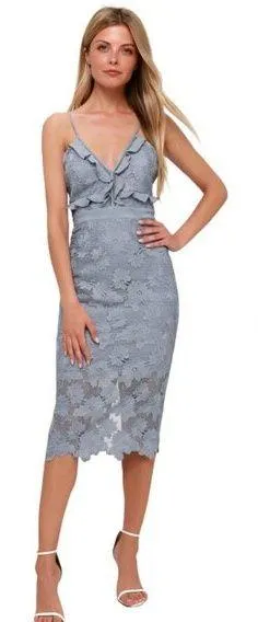 Crafted for a woman's wardrobe, the Bardot Vienna Lace Midi Dress is a versatile piece that transitions effortlessly from daytime to evening occasions. Its dusty blue floral pattern exudes a timeless charm, while the intricate lace fabric and ruffle accents add a touch of bohemian elegance. Designed to flatter with a high waist and slimming silhouette, this dress is ideal for parties, weddings, or even a sophisticated travel itinerary. The dress comes in a size 6, with a sleeveless V-neck that complements its pencil dress style, ensuring a comfortable fit for a regular size type. The combination of polyester and elastane materials offers a lightweight feel with just the right amount of stretch. Practical and chic, it features a back zipper closure, is lined for extra comfort, and requires dry clean only to maintain its beauty. Condition: Excellent Used Condition (no stains/holes/flaws)!! Size: 6/Small Material: Main 100% Polyester, Lining 95% Polyester 5% Elastane Style #: 602372 Original Price: $139 Measurements (taken while garment is laying flat): Underarm to Underarm: 16" Waistline: 14" Top of Shoulder to Bottom Hem: 43" Ships FAST, within 24 hours of order placement! Formal Event Evening Travel Vacation Gala Special Occasion Shower Bachelorette Rehearsal Dinner Night Out Feminine Girly Sexy Cut Out Frilly Slimming Timeless Elegant Chic Colorful Pastel