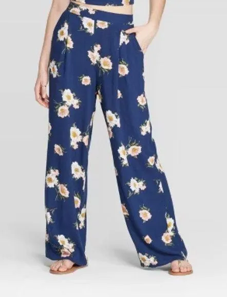 Xhilaration stylish wide-leg pants with a floral pattern. Features a navy-blue base with white and p... Show more