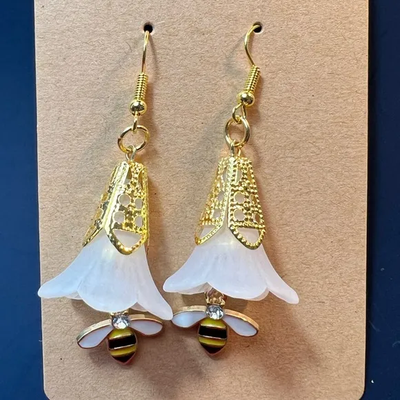 White Lucite Trumpet Flowers Bee Gold Tone Earrings - $14 New With Tags - From Shari