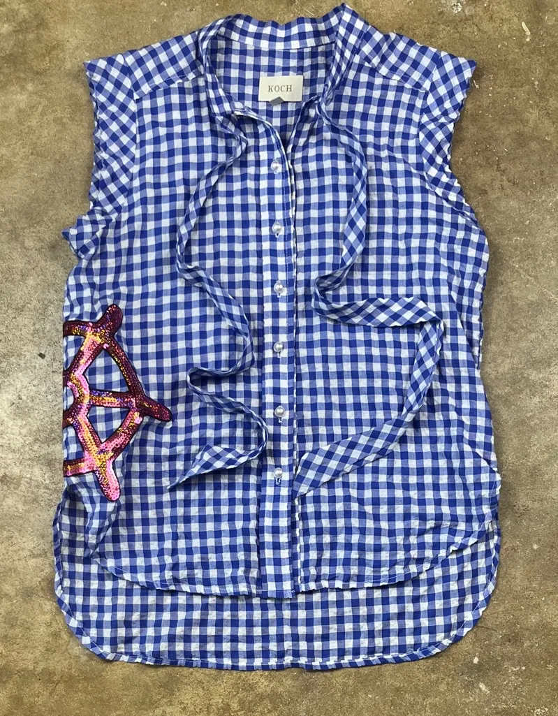 Chic blue gingham sleeveless blouse with ruffle details. Perfect for casual outings. Pit to pit: 17... Show more