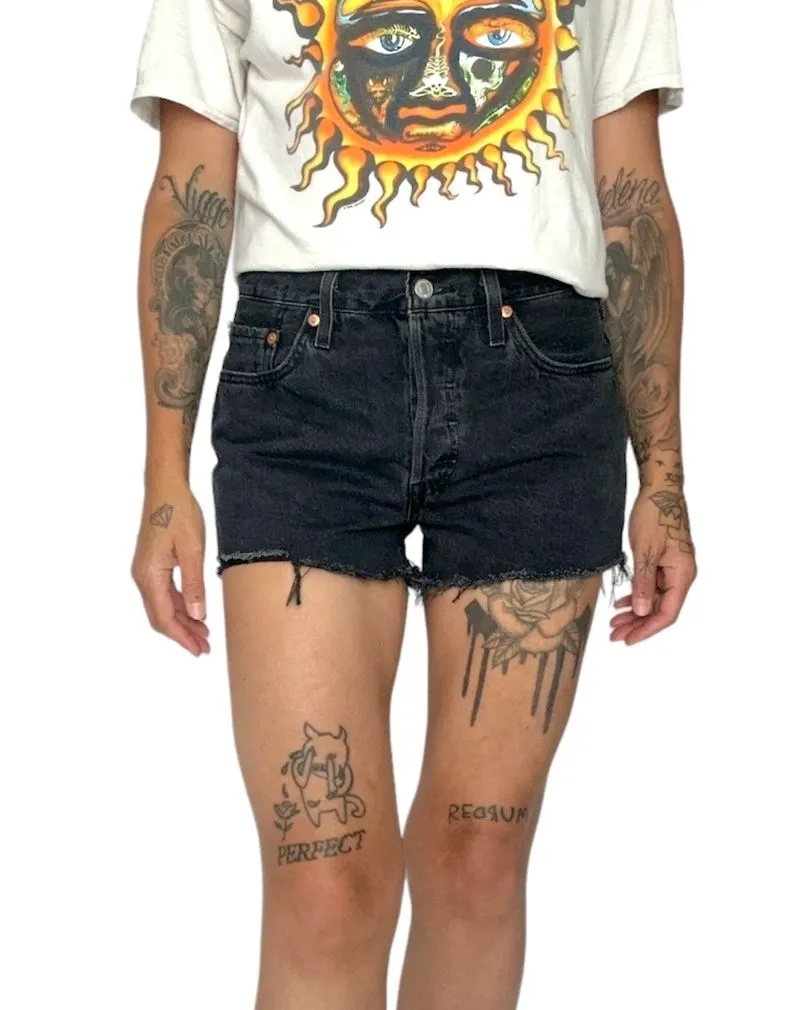 Classic Levi’s 501 original fit high rise denim shorts in a washed black. An iconic style that fits... Show more