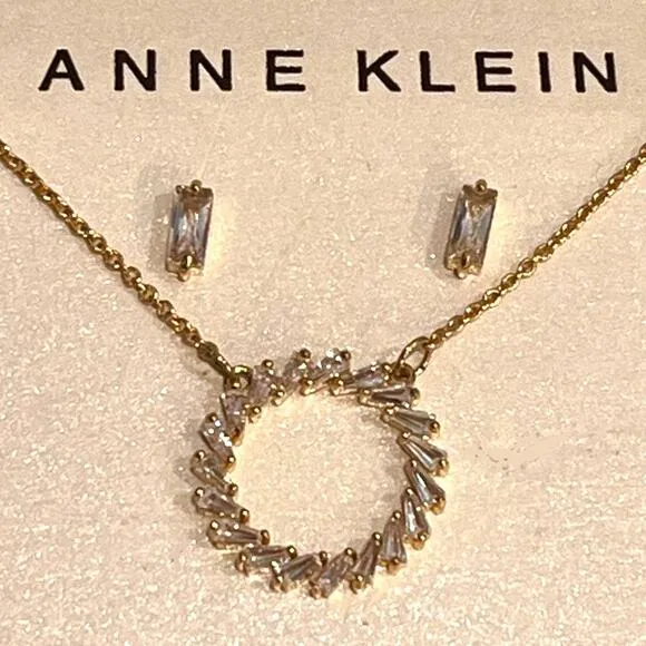 Anne Klein Gold Plate Cubic Zirconia Baguette 20”CIRCLE NECKLACE & EARRINGS SET - New On Card! Adju... Show more