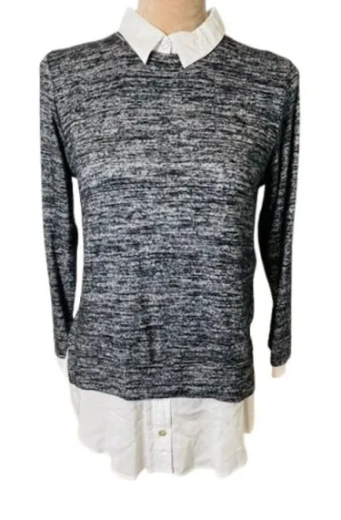 Marled black and white knit long sleeved lightweight sweater "twofer" top layered look solid white b... Show more