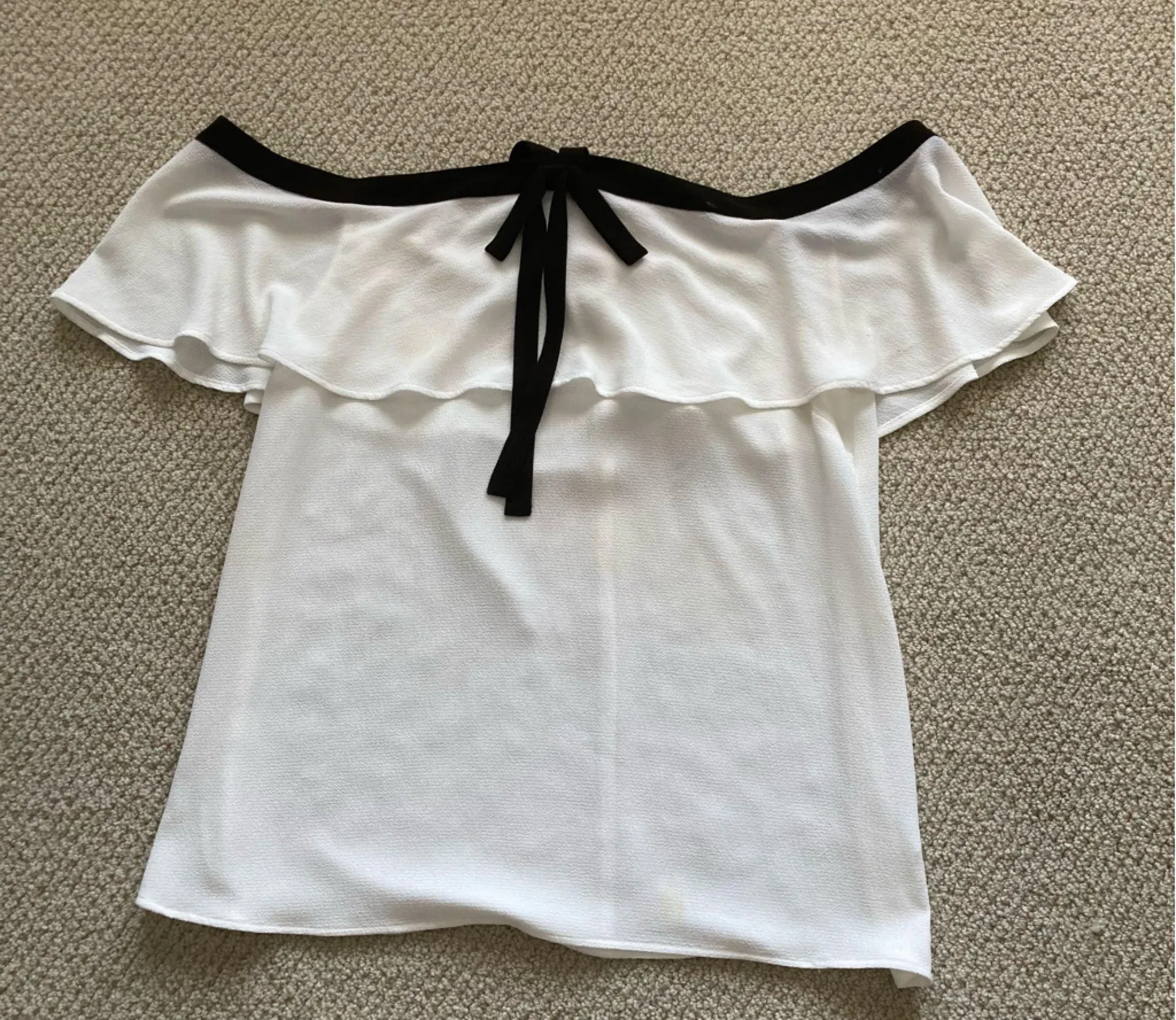 Vince Camuto Tiered Cold Shoulder Blouse White Black Size Medium Flowy FLAWS Fair / flawed conditio... Show more
