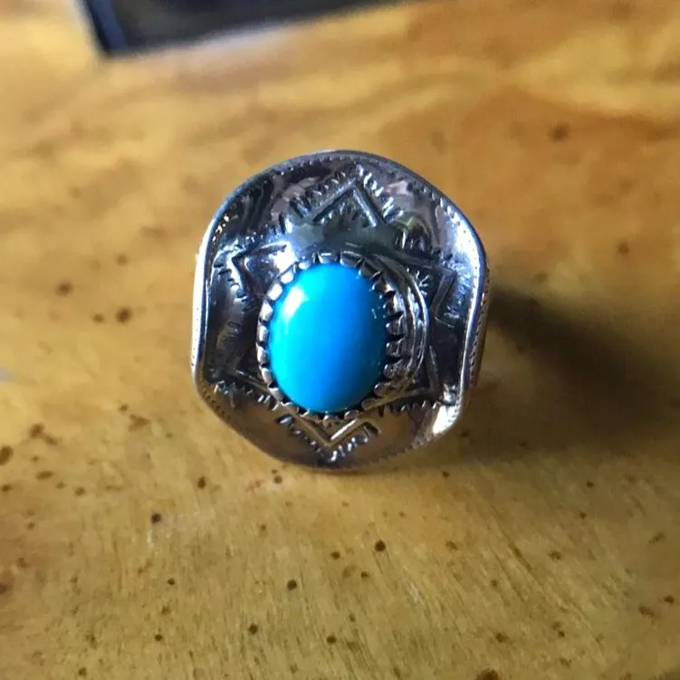 This beautiful ring is made with a genuine sleeping beauty turquoise stone (1.60 ctw). The ring has an adorable cowboy/cowgirl hat design. It is set in solid .925 sterling silver, and it has an antique look on the band. Please see photos for quality and measurements. Size 5. J13
