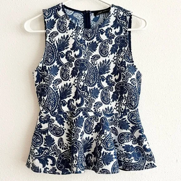 Gently pre-owned/great condition! Paisley Textured Jacquard Style Sleeveless Peplum Rich Blue / Whit... Show more
