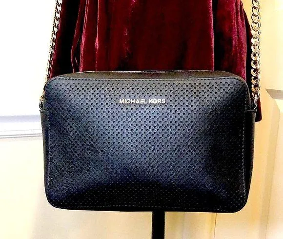 MICHAEL KORS Jet Set Perforated Black Saffiano Leather Crossbody with Silver Chain Leather Strap Bl... Show more