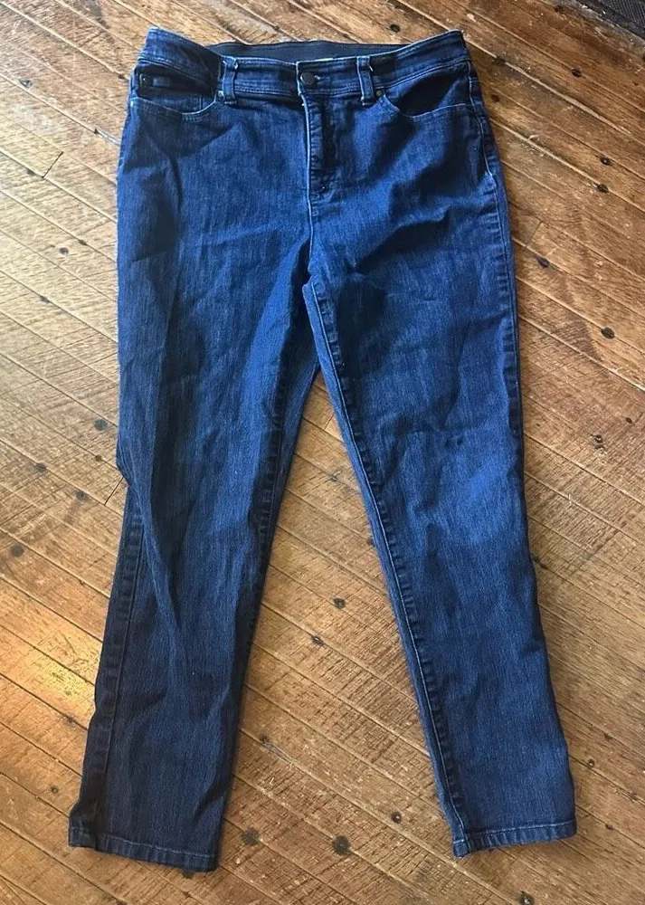 Chico’s fabulously Slimming, dark wash, slim leg, ankle jeans. Pairs well with a flowy top and flats... Show more