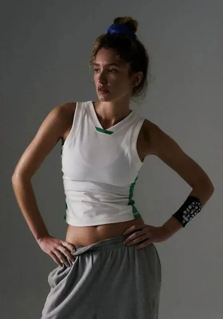 n essential for to-from commutes, this tank features a soft and smooth jersey fabrication and unique high v-neckline for an instantly sporty-sleek look. Fit: Fitted; cropped; high v-neck Features: Soft, smooth jersey fabrication; slight stretch; fitted silhouette; cropped hem hits just above waist; high v-neck; wide, racer back; ribbed cuff and neck detail; color block side detail