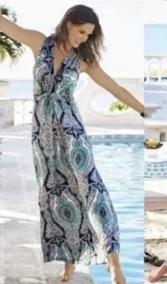 Navy, tan, teal,white,light pink Paisley print Knotted front Sleeveless Maxi V-neck 91% polyester,9% elastane-stretchy Tags: Cruise wear, nautical, tropical, vacation, travel, vacay, summer, spring break, swim, resort wear, beachy, water, pool, lake, surf, boating, tanning, sunbathing, Hawaii, trip, beach Medium Condition: preowned. no rips, holes or stains. Length 58” Bust 19” R3