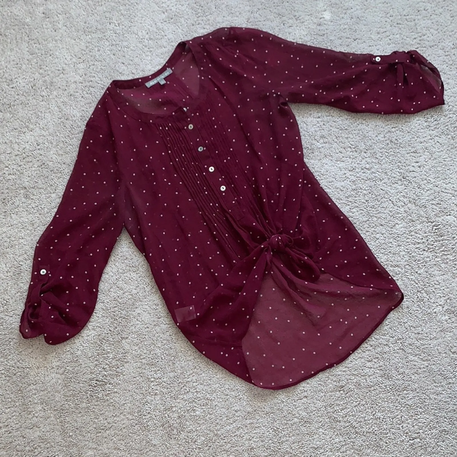 Daniel Rainn - Dark red/burgundy, sheer blouse with white polka dots. Buttons half way down the front. Pleats in the front and back provide a cute detail. Tab 3/4 sleeves. Cute tied up, as shown in photos. Size small Pit to pit - 19" Length - 28" **Approximate measurements taken laying flat