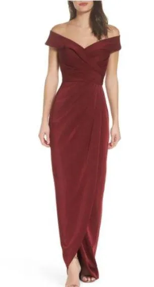 La Femme Surplice Off the Shoulder Column Gown An elegant shrugged-off neckline shrouds the shoulde... Show more
