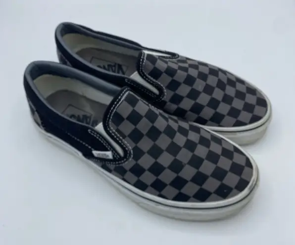 Gently used Womens 7.5 Vans slip-ons with a bold checkerboard design. Features black and gray patter... Show more