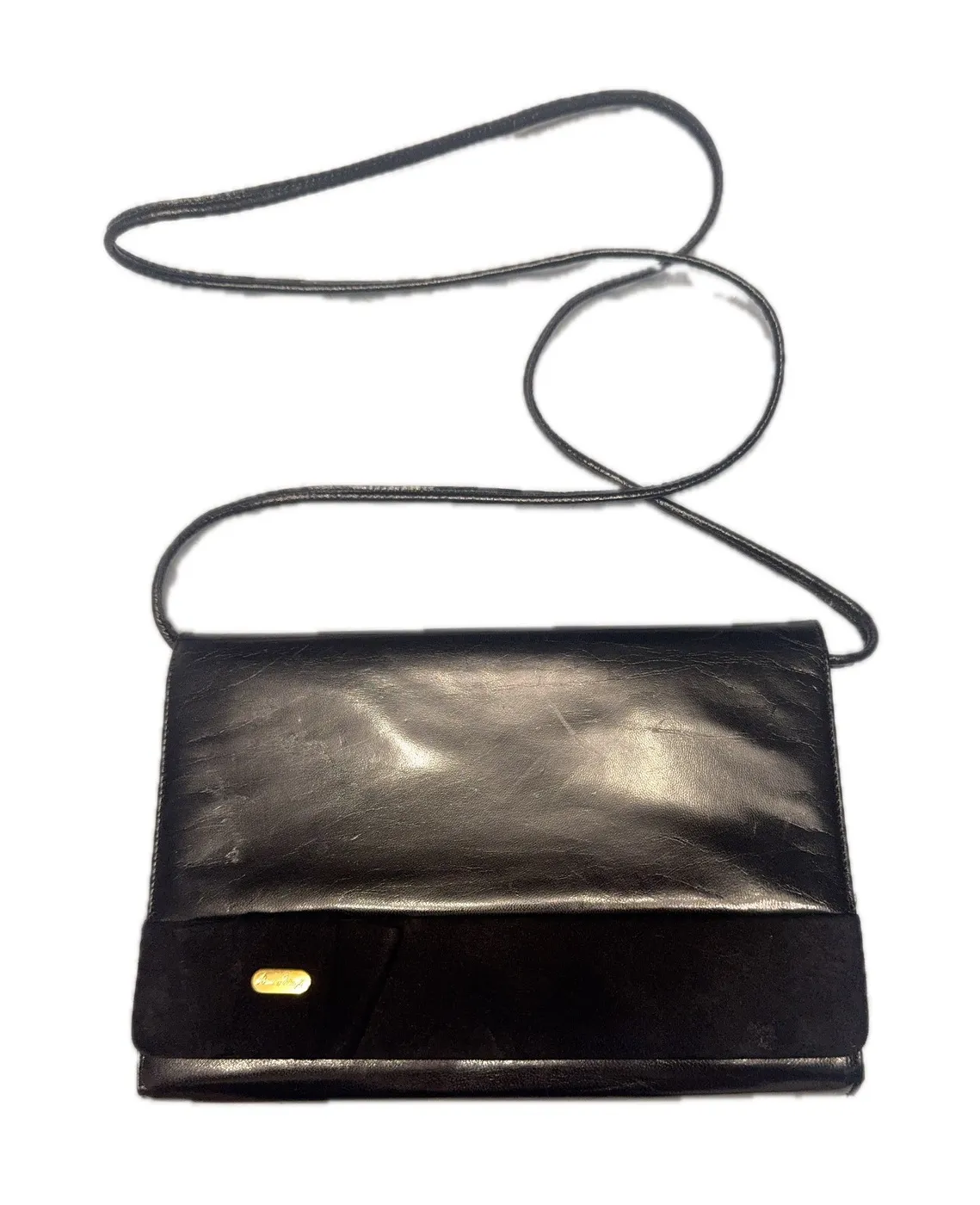 Bruno Magli Vintage Black Leather Crossbody Bag Authentic vintage Bruno Magli shoulder/crossbody bag crafted in supple black Italian leather with suede panel detailing and gold logo hardware. Features magnetic snap closure, interior compartments for essentials, and a slim leather strap for easy wear. Measurements: • Width: 9.25" • Height: 6.5" • Strap drop: crossbody length • Interior: multiple compartments Classic, elegant, and timeless — a true Italian luxury staple. Perfect size for day-to-night wear. Brand: Bruno Magli Made in Italy Condition: Vintage, leather shows light surface wear consistent with age, but overall in good shape. Keywords: Bruno Magli, Leather bag, Suede bag, Crossbody, Shoulder bag, Convertible bag, Vintage bag, Designer bag, Black purse, Made in Italy, Luxury handbag, Evening bag, Clutch