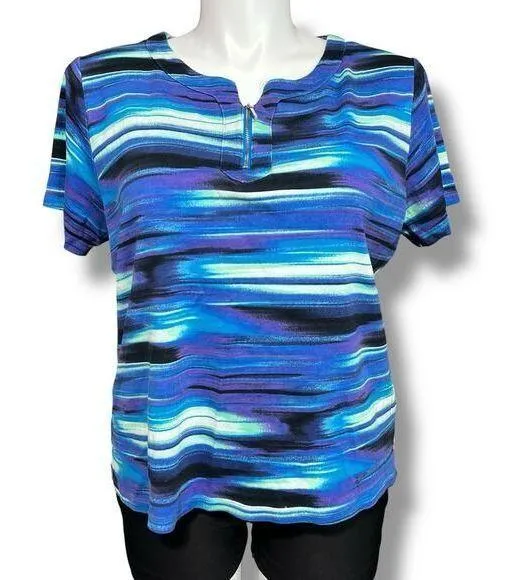T-Shirt Top Round Neck Pullover Short Sleeve Stripes Blue Purple Rafaella Condition: Excellent used condition Size: Plus Size 2X Description: T-Shirt top Pullover Round neck with zipper accent Short sleeve Bright and colorful blue purple and black striped Stretchy and breathable Made in China 100% Cotton Hand Wash Approx measurements: 24" pit to pit 24.5" stretch If purchased by noon central time I try to ship same day Weight: 11O SKU: Blue Purple Striped Round Neck Short Sleeve Pullover T-Shirt Top Rafaella