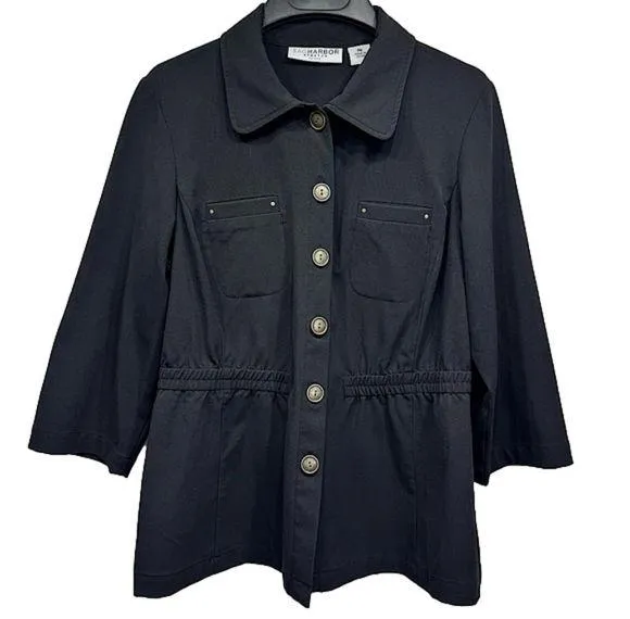 Sag Harbor black elastic cinched waist button front blazer. Bronze colored large buttons and studs, 3/4 sleeves. Women’s size petite medium. Excellent preowned condition. Clean, smoke free home. Five star seller. Super fast shipping! Measurements 20” armpit to armpit 25” length *measurements are approximate * shirt sold separately sku#23967 SKU# 23968 10