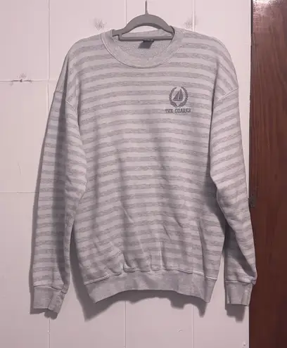 Gray and white striped crewneck sweatshirt from H.L. Miller Gold. Features embroidered "The Ozarks" text and a sailboat logo within a laurel wreath on the left chest. This comfortable sweatshirt is perfect for casual outings, weekend adventures, or relaxing at home. Style: Pullover Department: Unisex Adults Type: Sweatshirt Closure: Pullover Theme: Letters, Numbers & Words, Sea Life Features: All Seasons, Breathable, Easy Care Fabric Type: Knit Pattern: Striped Material: Cotton, Polyester Accents: Embroidered, Logo Sleeve Length: Long Sleeve Neckline: Crew Neck Keywords: crewneck, pullover, embroidered, sailboat, laurel wreath, striped, casual wear, loungewear, vintage style, travel, gift for her, outdoors