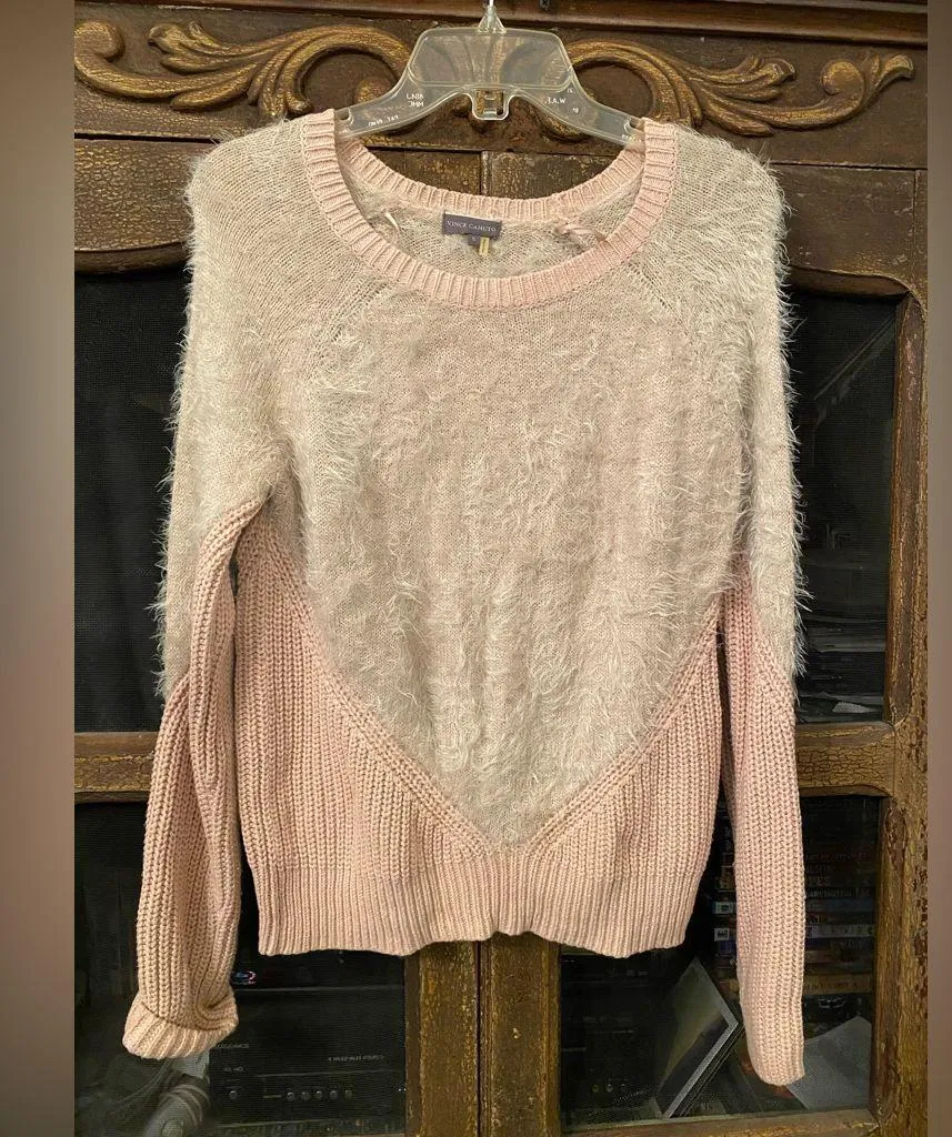 Stylish Vince Camuto sweater. Features a fuzzy cream body with pink ribbed accents. Perfect for cozy... Show more