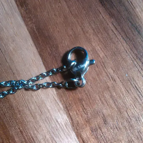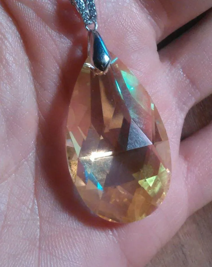 This beautiful pendant necklace features a large, faceted simulated yellow topaz stone. The pendant is set in 925 sterling silver while the necklace chain is stainless steel. The necklace is approximately 20 inches in length. Brand new. B7
