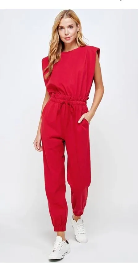 “Shana” Shoulder Muscle Padded Sleeveless Jogging Red Jumpsuit. Crew neckline, relaxed, silhouette, padded shoulders, elastic & ruffled waist with drawstrings. Elastic ankles. Back button closure. Open back. Size: Medium
