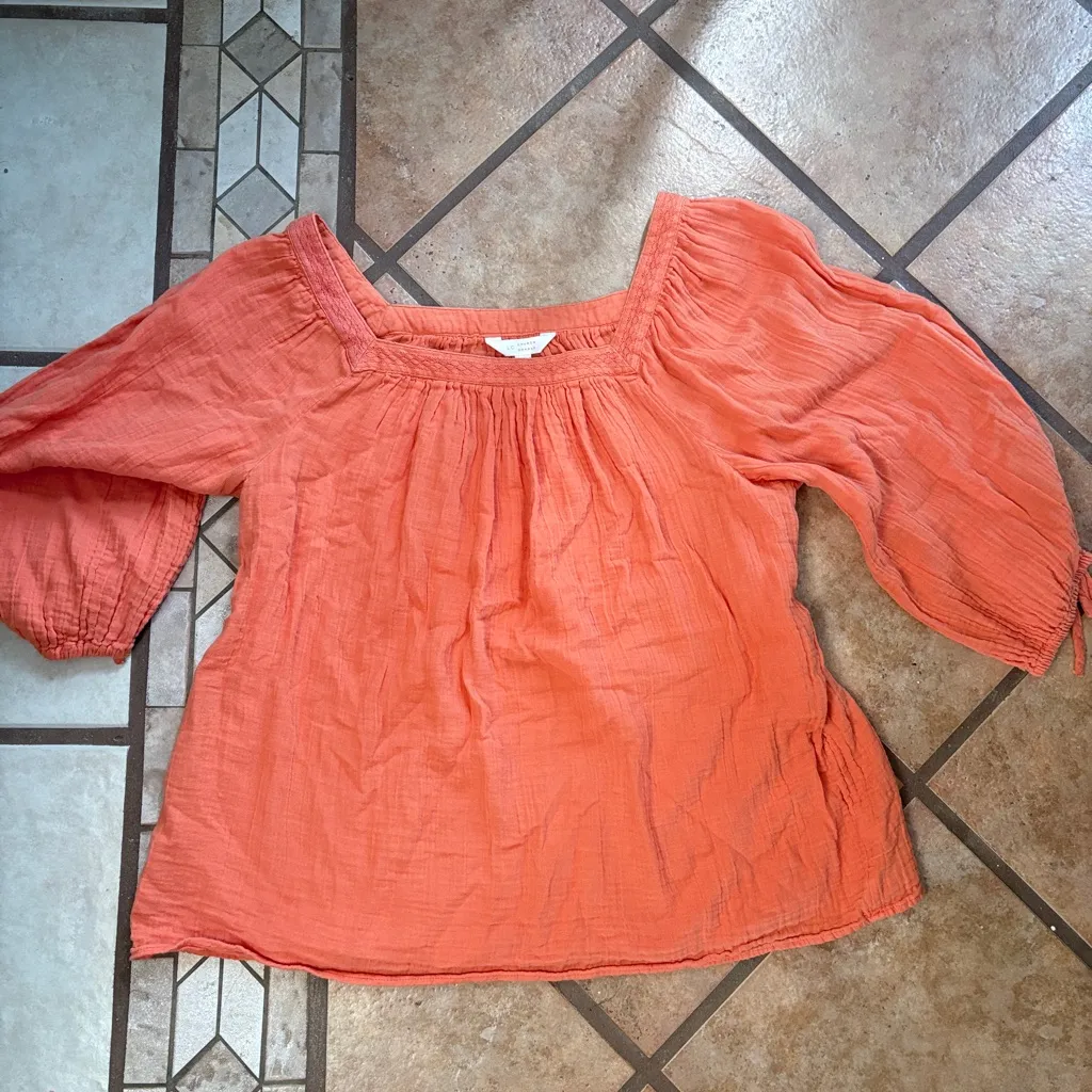 Stylish coral blouse with square neckline. Flowy sleeves for a relaxed fit. Perfect for casual outin... Show more