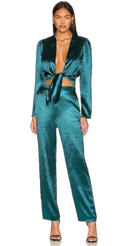 $248 Lovers + Friends Kendall Green Satin Cut Out Long Sleeve Jumpsuit Medium Dark Jade Green 100%... Show more