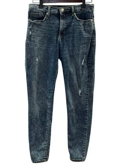 Distressed medium stone washed Banana Republic high rise skinny ankle jeans. Almost look slightly ac... Show more