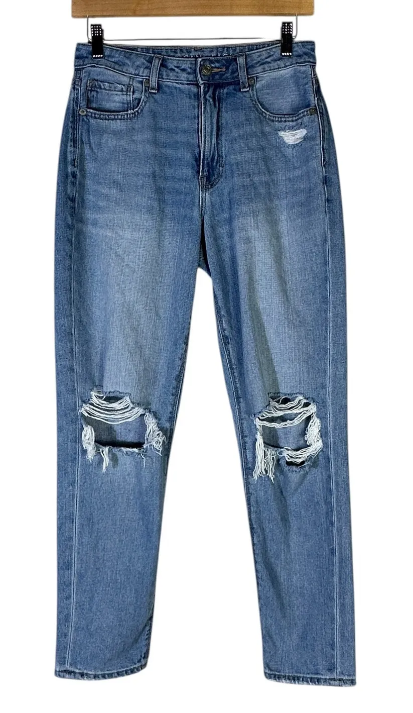 Mom Jean High rise Distressed Ripped knees Whiskering Button fly 5-pocket styling Tapered leg Medium... Show more