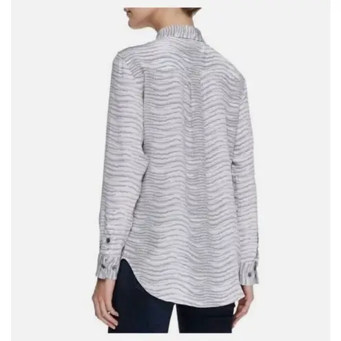 $225 Equipment Femme Slim Signature Button Up Blouse 100% Silk Womens Size Small Excellent preowned condition no flaws Equipment Femme Gray zebra print button up blouse 100% Silk Collared neck Long sleeves Button cuffs Relaxed fit Button down placket Chest flap pockets #11e749 Tags: wardrobe staple, minimalist, trendy, classic, chic, animal print, silk, luxury, quiet luxury, neutrals, designer, business casual, work, office, career, basic, officecore, businesscore, aesthetic, office casual,
