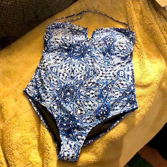 Jessica Simpson One Piece Swimsuit Size XL Blue and white kaleidoscope design Fastens around neck w... Show more