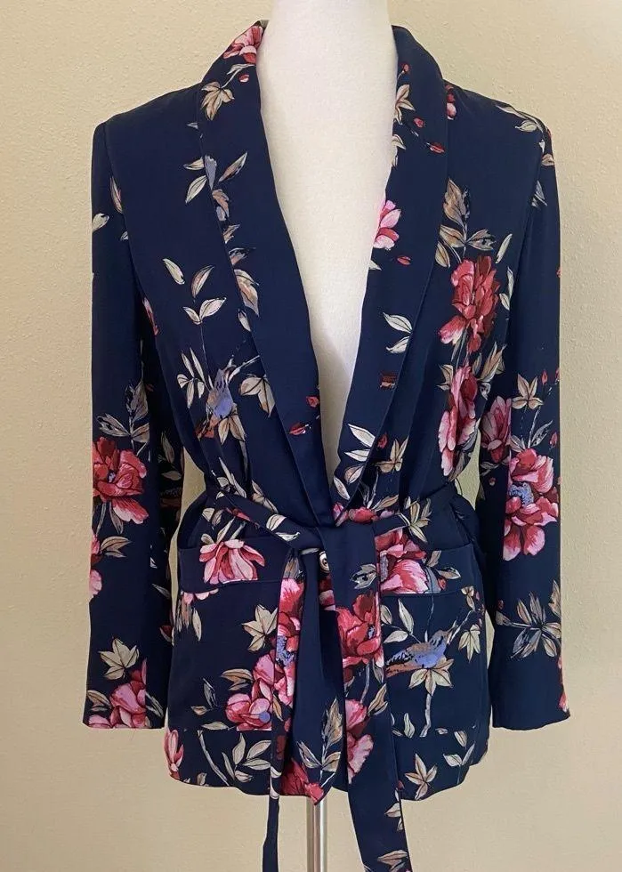 Chic navy blazer with vibrant floral design. Features a stylish tie belt. One button front Side poc... Show more