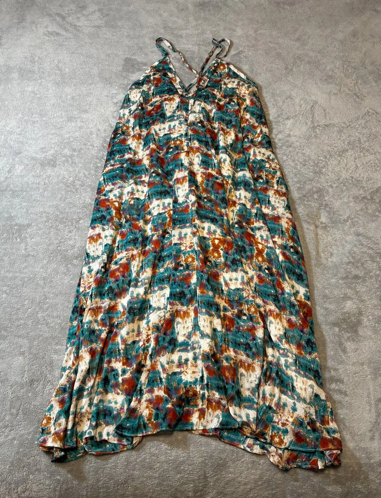 Bishop and Young maxi dress. Women's medium, slouchy flowing breathable fit. Good condition, like new. Flowy silhouette with adjustable spaghetti straps, V-neckline, and a stunning abstract tie-dye print in teal, rust, ivory, and golden tones. Maxi, abstract, boho, beach, Anthropologie style, flowing, rustic, adjustable, natural, wedding, date, teacher, professional, boss, elegant. Review pictures for condition and true measurements.