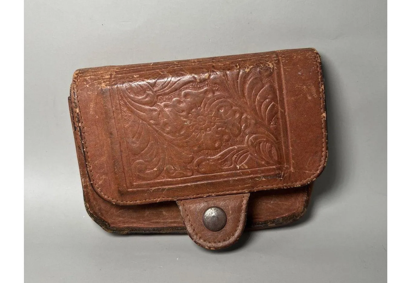 Condition: Good vintage condition with visible signs of wear, scuffing around the edges, patina on the snap hardware, and some wear on interior seams as shown in photos.Front snap is present but does not hold close. Made from genuine top grain cowhide leather with detailed floral embossing on the front flap. Main compartment features a zipper closure for secure storage. Includes an integrated mirror set into the interior flap, typical for vintage makeup or travel purses. Secondary front pocket with snap closure, plus interior slip pocket for organization. Stamped "Top Grain Cowhide Made in Italy" inside the flap. Rich brown leather with natural vintage aging and character. Approximate width: 5 inches (as shown in ruler photo). Original snap buttons and zipper; wrist strap attached for easy carrying. A classic 20th-century accessory; ideal for collecting, display, or vintage use. bin 82