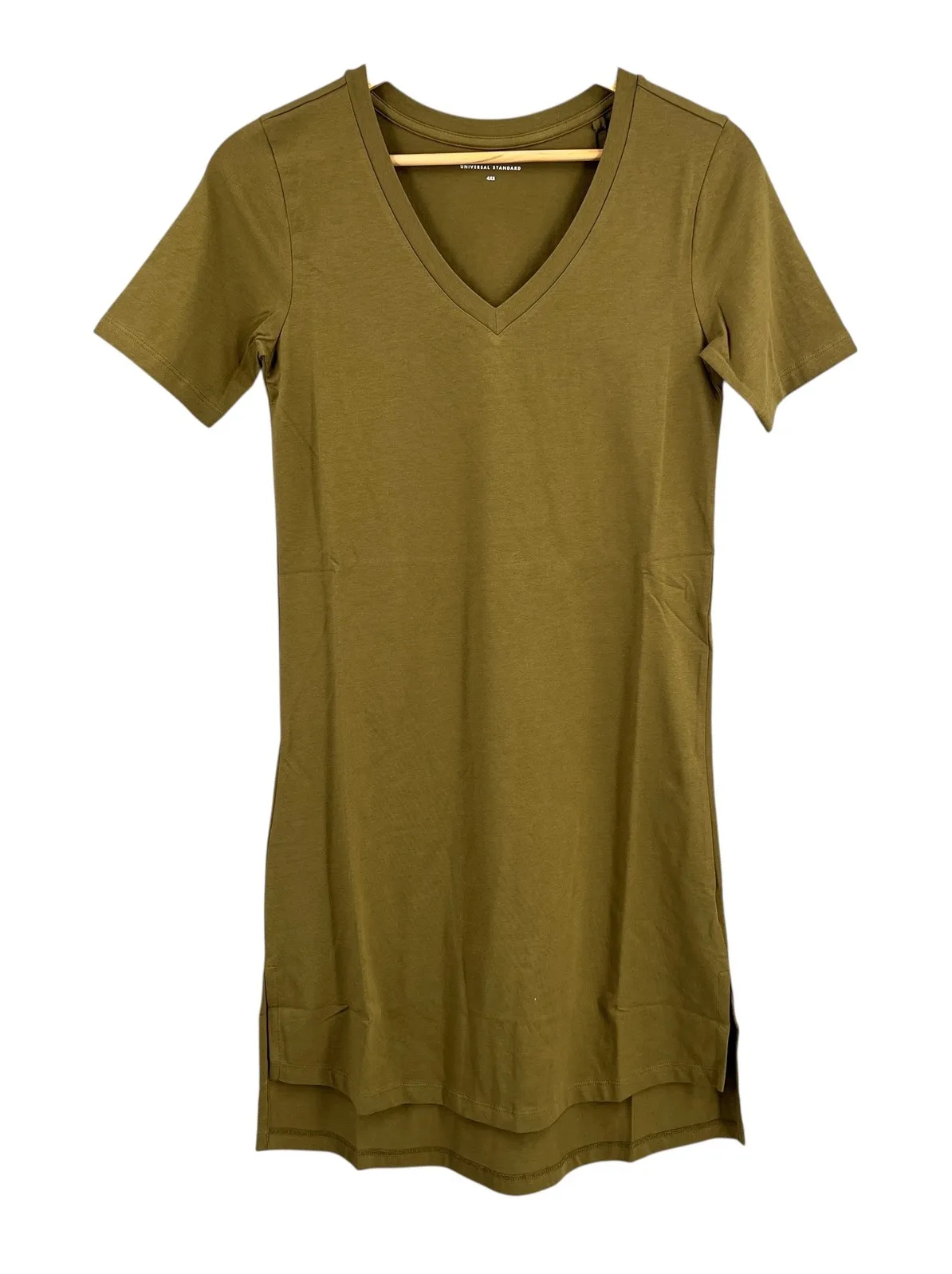 Flattering and effortless, this Universal Standard Tesino dress is a military olive green t-shirt dress with a v-neckline and high-low hem. Soft, stretchy cotton blend (93% cotton, 7% elastane). Fits size 00–0 Armpit to armpit: 15.5" Waist: 15" Length: 36" (back), 33" (front) New with tags Keywords: Universal Standard, T-Shirt Dress, Knee Length, Military Olive, Casual Dress, Comfortable Dress, Cotton Dress, V Neck, Plus Size, Everyday Dress, Relaxed Fit, Basic Dress, Tee Dress, Contemporary, 4XS