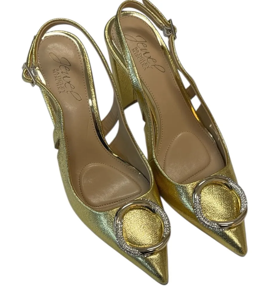Jewel by Badgley Mischka gold pumps with pointed toe and circle emblem Size 6 New, no box Ankle strap, sling back Block heel Old Hollywood vibe #badgleymischka #cocktailparty #eventshoes #partyshoes #holiday #oldhollywood