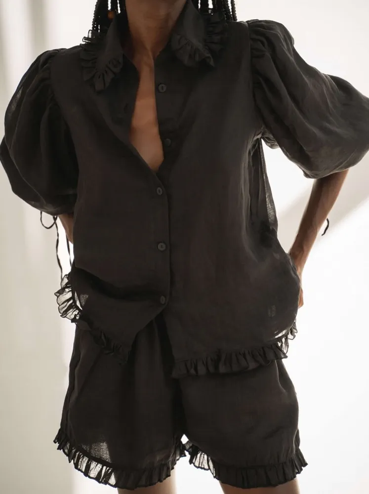 Lu-ciee Valerie Ramie Shirt black eco-friendly button collar blouse size small Good condition , slight fading/white around collar The elaborate Valerie Ramie Shirt combines realism with a large pinch of romanticism. Crafted from 100% Ramie fabric the Valerie Shirt features a lined interior, classic collar with ruffle edge, bubble sleeves and a ruffle at hem edge. Valerie is fitted at the bust and gradually flares out into an A-line shape as it extends toward the hemline. Pair with denim or our Valerie Ramie Shorts for a unified look. Exquisite Ramie Natural fabrication Trapeze style shirt Classic collar with ruffle edge Bubble sleeves with an adjustable string closure Line of racin buttons at the front Ruffle at hem edge Color: Black Material: Outer - 100% Ramie* / Inner: 100% Cotton Care instructions: Machine wash at max. 30ºC/86ºF with short spin cycle. Do not tumble dry. *Ramie, also known as Chinese Nettle, is a natural fiber and has been used for over 6,000 years. The appearance and hand are somewhere between those of cotton and linen. Ramie fibre is easily laundered, increasing in strength when wet, and does not shrink or lose its shape. Length: 24.409 inches
