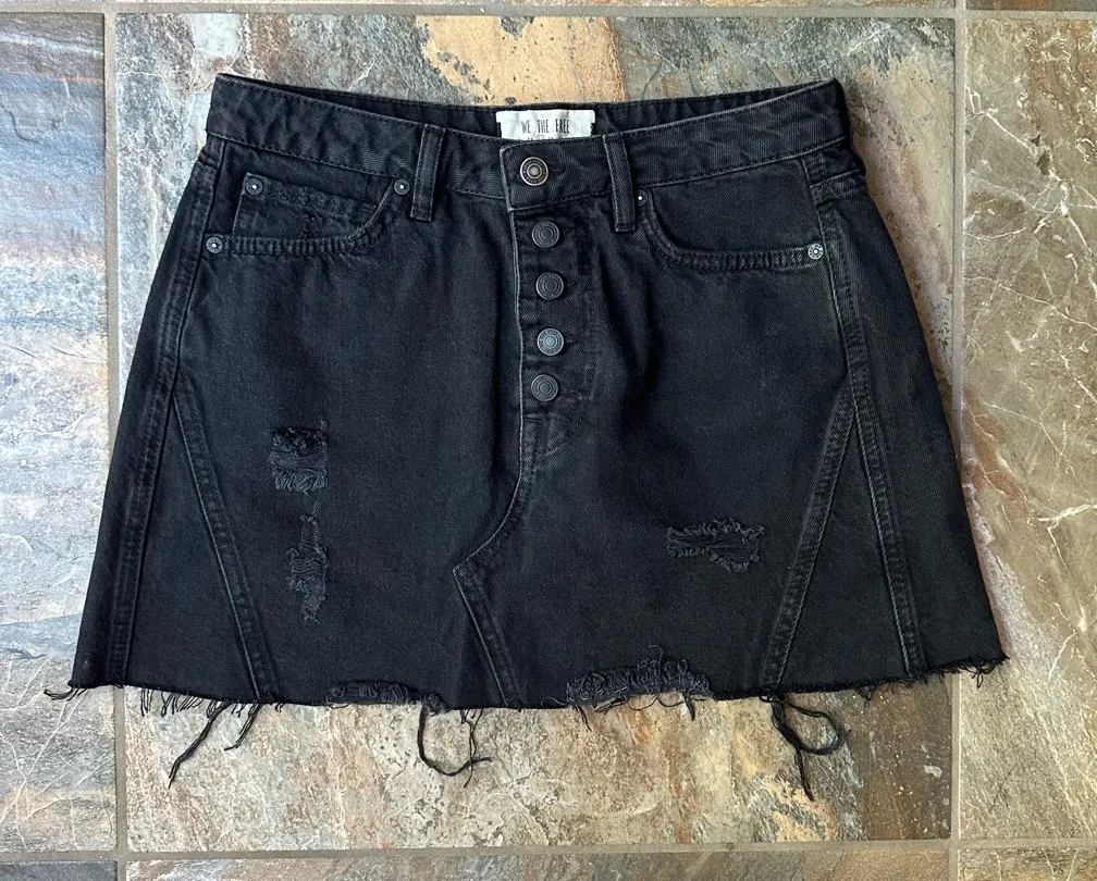 We the Free by Free People Women’s size 27 Black Distressed Button Fly Denim Mini Jean Skirt High Ri... Show more