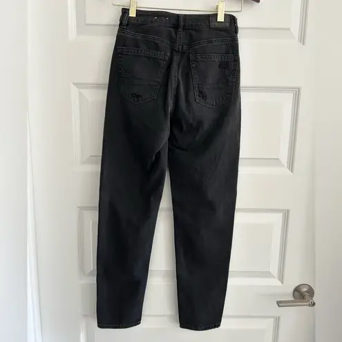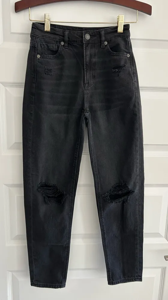 American Eagle Mom Straight Jeans, black distressed, size 000 Waist 23” Rise 10” Inseam 26”