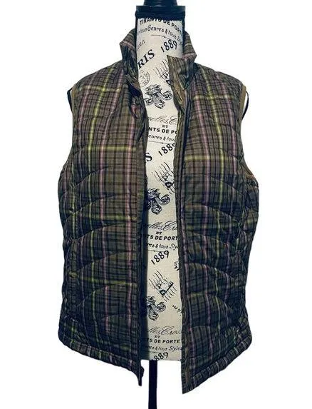 Lands End Green Quilted Full Zip Plaid Woman’s Vest Colors: green, brown, pink Size: s Outer shell:... Show more