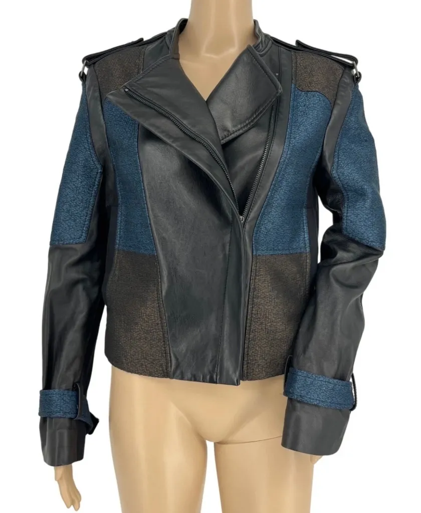 BCBG Max Azria Patchwork Color Block Lamb Leather Tweed Moto Jacket in Black and Blue and Womens Siz... Show more