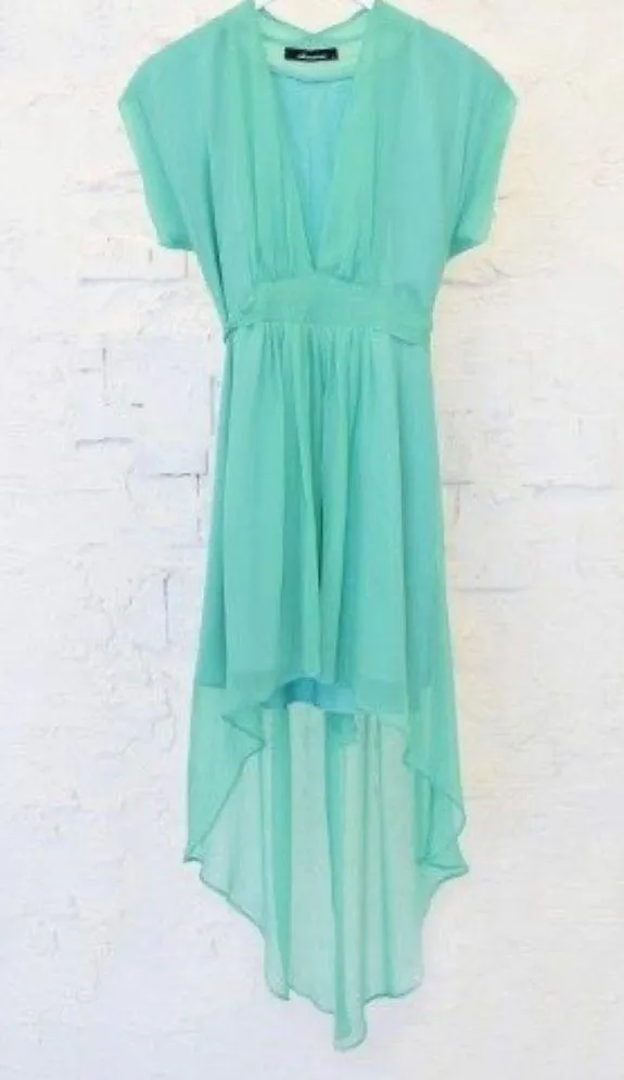 High low hemline Low cut vneck 100% silk Tie back zipper side closure Light and flowy dress Measure... Show more