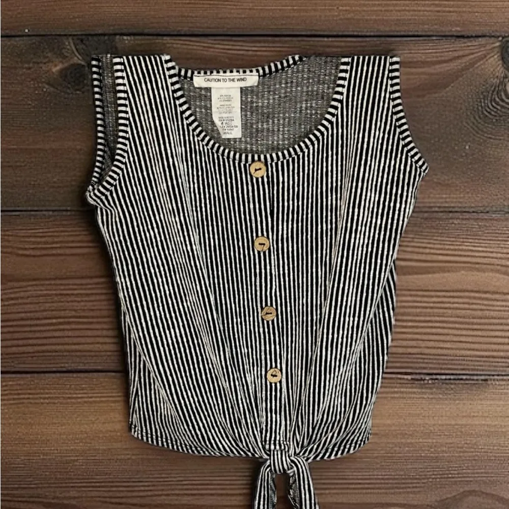 Stylish tank top with vertical stripes. Features button-down front and tie detail. Ideal for casual... Show more