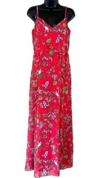 Nanette Lepore Paradise Dreaming Floral Maxi Dress Crimson Crush Print Hummingbirds and floral patt... Show more