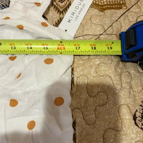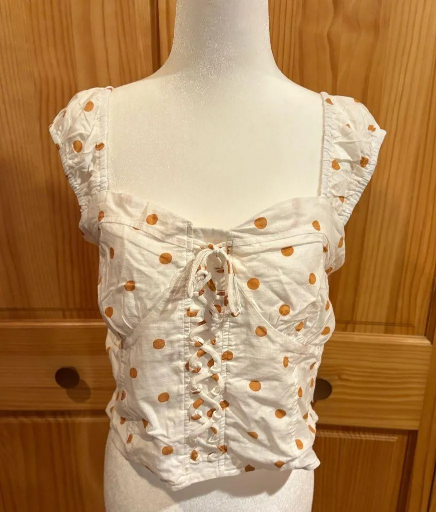 Kirious Los Angeles polka dot crop top. This style features A sweetheart neckline with a lace-up front and cap sleeves, in a polka dot pattern like the orange and white dots seen in the image. It belongs to the brand "Kirious Los Angeles," which is known for its trendy and often cropped women's tops. Women’s XL this crop top is NWOT Thanks for looking! A/K