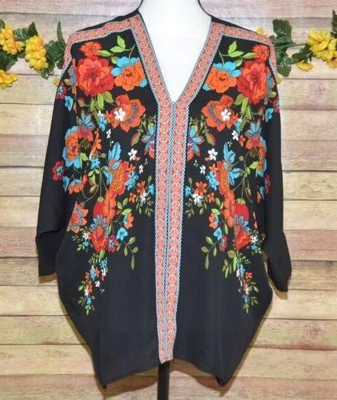 Elevate your wardrobe with this Pretty Boho Rose + Olive Ladies Black Floral Oversized Pullover Blouse. Perfect for casual outings or a night out, this V-neck top features colorful floral patterns and 3/4 dolman sleeves. ⢠Black floral blouse ⢠Oversized pullover style ⢠V-neck design ⢠3/4 dolman sleeves ⢠Perfect for casual or night out Location: Section 10 Please SEE measurements of the clothing items to insure fit! Measurements are in the last photo. To check measurements, measures a well fitting garment laying flat unstretched. We double the measurement for bust/chest/waist/hip/thigh and leg opening. Length is measured from shoulder to hem. Inseams are measured along the inseam. When you see TWO measurement for one area it is because the item has stretch and one is laying flat and the other is stretched. š Size: Womens S Condition: Pre-Owned Like New Excellent Condition Thanks for looking at my listing. I have been selling online for several years and take pride in the items that I am listing and feel they will make a great addition to someone's wardrobe or home. All the items I am listing have been checked by several people and do not have any flaws such as holes, rips, or stains. Any issues a piece may have will be disclosed and will be included in the photos. Please feel free to ask any questions you might have we are happy to answer š Happy Shopping.