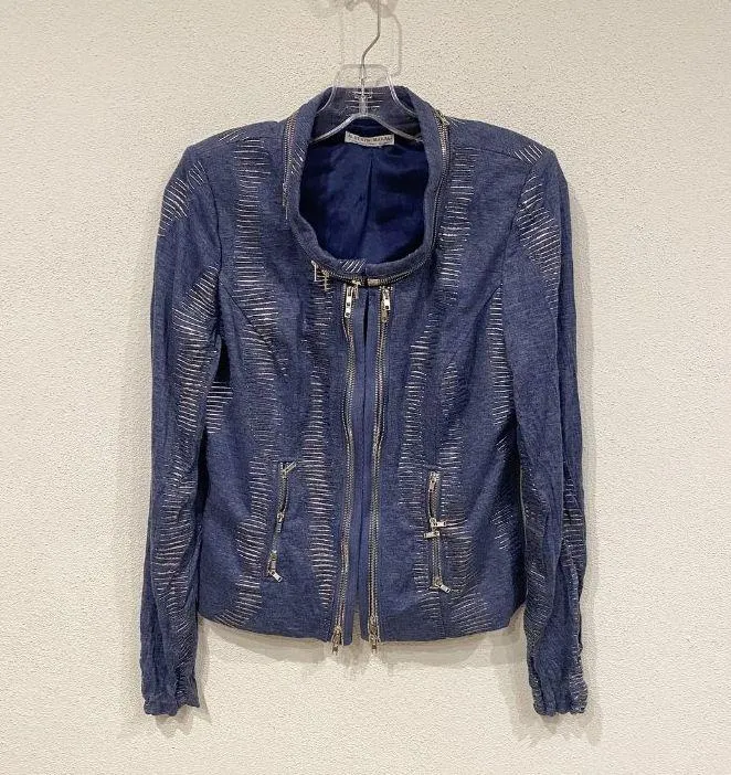 Bust: 19" across Length: 22.5" Condition: Gently worn, no visible flaws Features a moto-inspired design with textured metallic silver accents throughout Full zip front with dual zippers; zippered pockets at front Crinkle, lightly stretchy knit construction for comfort and style Material: 60% Polyester, 35% Viscose, 5% Spandex Tag size: Medium (Womens) Rich blue color with shimmering metallic detail Brand label: Alberto Makali (New York, Paris, Milano) Care: Hand wash cold, lay flat to dry or dry clean Perfect lightweight jacket for evening, work, or casual outfits